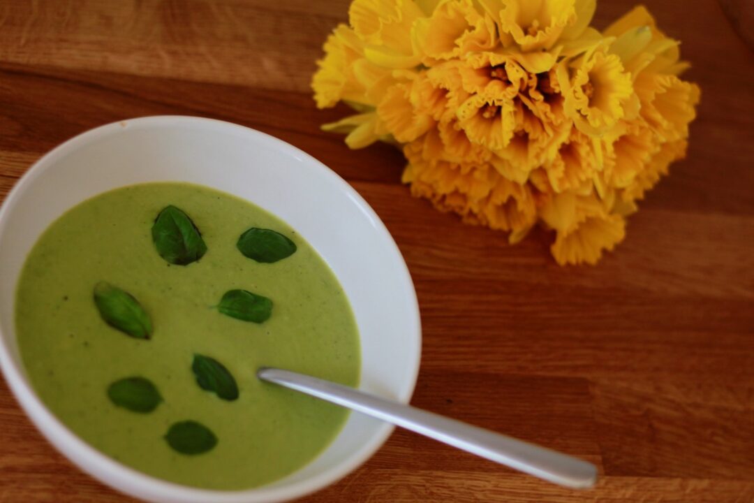 W garnku roztapiamy masło, dodajemy do niego posiekanego pora i dusimy pod przykryciem 5 minut. Wrzucamy groszek, dodajemy 100 ml wody, gotujemy do miękkości. Dolewamy mleko kokosowe i krowie oraz bazylię. Gotujemy 5 minut pod przykryciem. Blendujemy na gładko. Dekorujemy listkami bazylii.